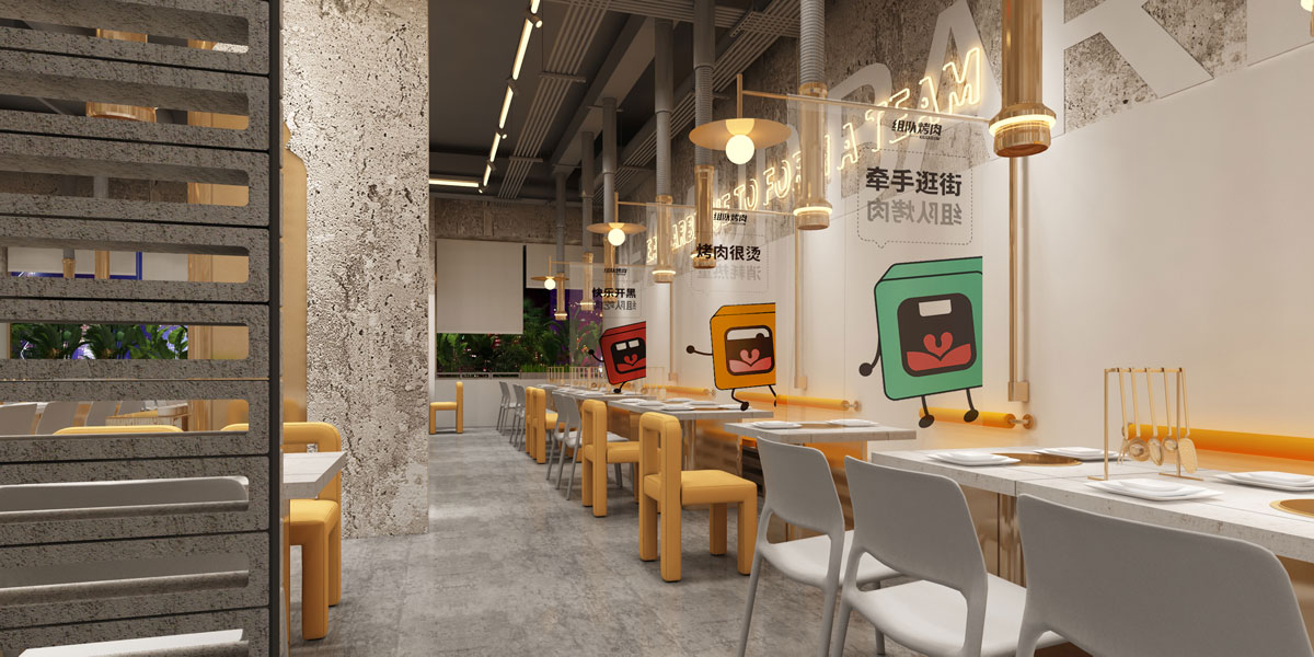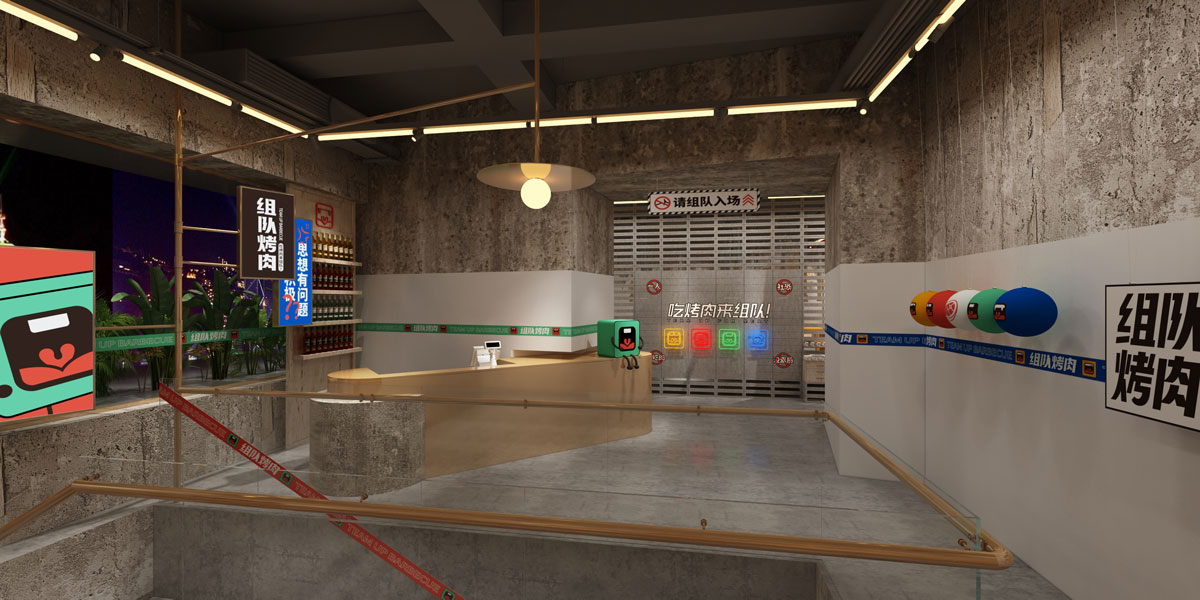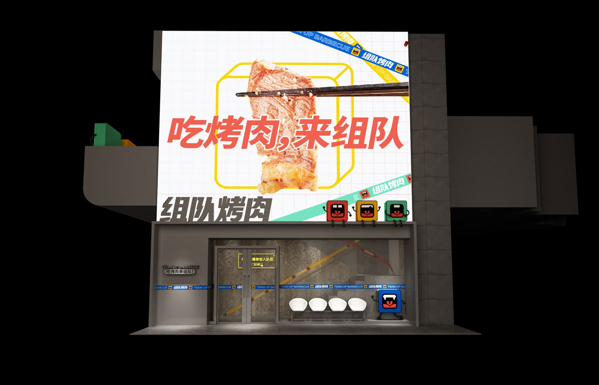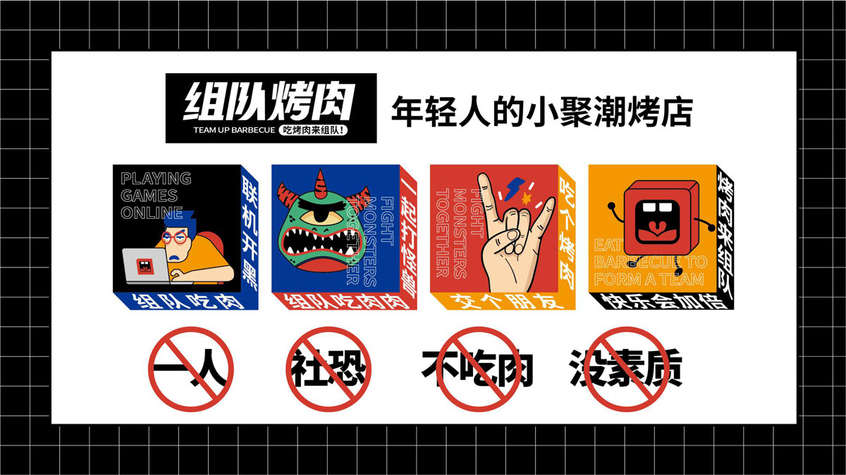 根據(jù)對(duì)湖南本地烤肉品牌的考察,確定組隊(duì)烤肉以年輕群體社交場(chǎng)景為定位方向,主打年輕潮流文化。提煉出品牌塑造的三個(gè)關(guān)鍵詞:年輕、潮流、小聚,打出“吃烤肉,來(lái)組隊(duì)”的超級(jí)口號(hào)??臻g及品牌設(shè)計(jì)以五花紅,潮藍(lán)為主色調(diào),在空間設(shè)計(jì)中體現(xiàn)時(shí)下潮流用語(yǔ),更貼近年輕人的生活語(yǔ)境,讓客戶(hù)在用餐時(shí)能對(duì)品牌有會(huì)心一笑的認(rèn)同感。從而實(shí)現(xiàn)超級(jí)口號(hào)的可持續(xù)性傳播。