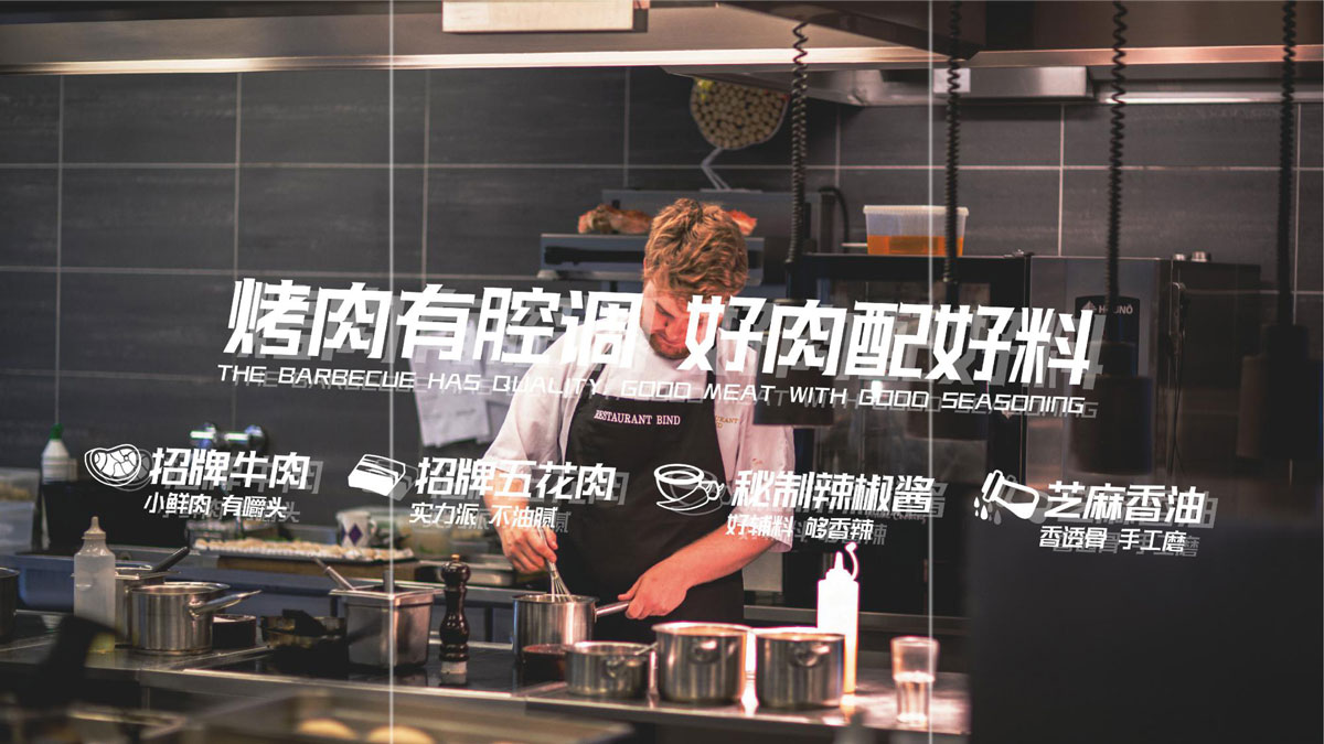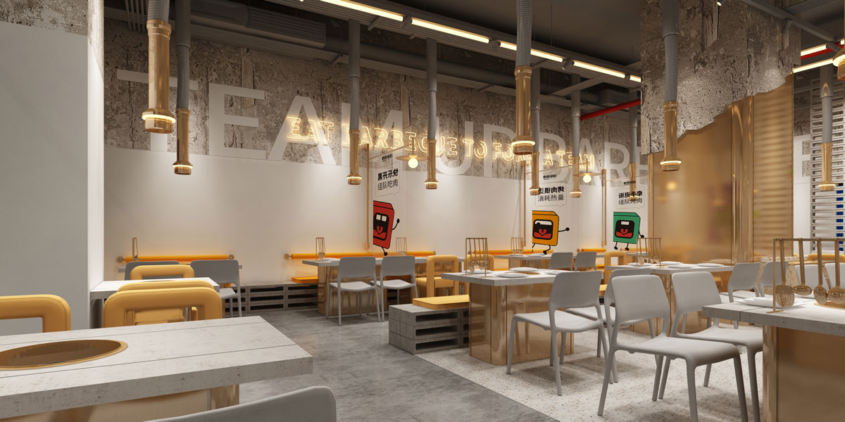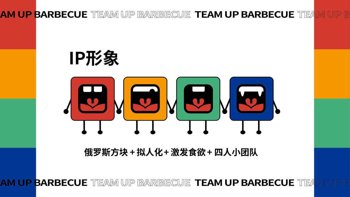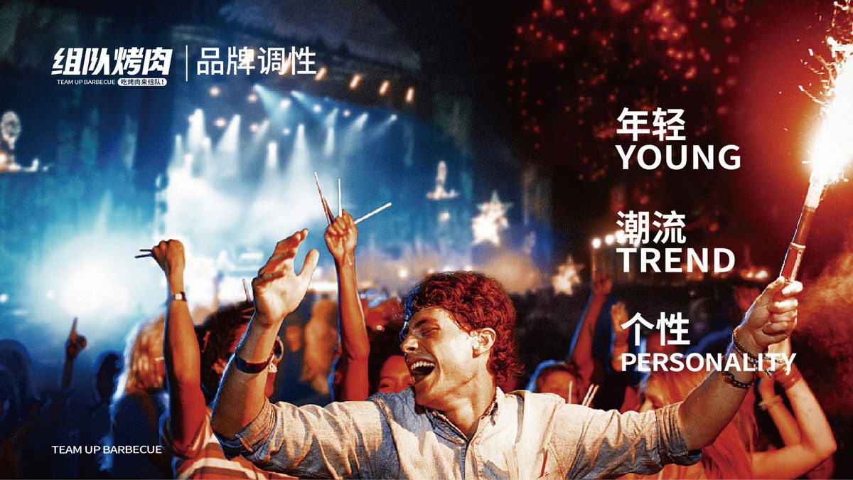 根據(jù)對(duì)湖南本地烤肉品牌的考察,確定組隊(duì)烤肉以年輕群體社交場(chǎng)景為定位方向,主打年輕潮流文化。提煉出品牌塑造的三個(gè)關(guān)鍵詞:年輕、潮流、小聚,打出“吃烤肉,來(lái)組隊(duì)”的超級(jí)口號(hào)??臻g及品牌設(shè)計(jì)以五花紅,潮藍(lán)為主色調(diào),在空間設(shè)計(jì)中體現(xiàn)時(shí)下潮流用語(yǔ),更貼近年輕人的生活語(yǔ)境,讓客戶(hù)在用餐時(shí)能對(duì)品牌有會(huì)心一笑的認(rèn)同感。從而實(shí)現(xiàn)超級(jí)口號(hào)的可持續(xù)性傳播。
