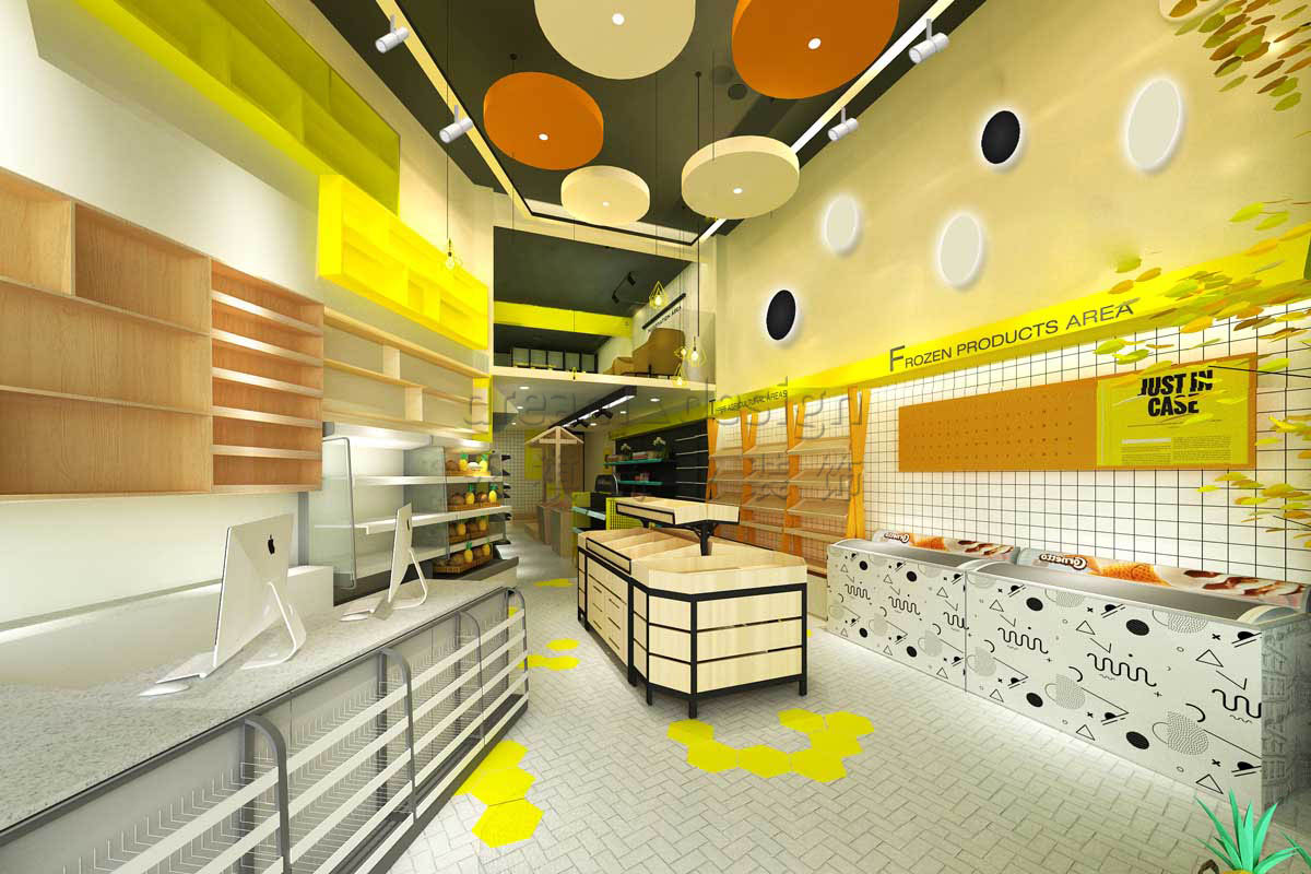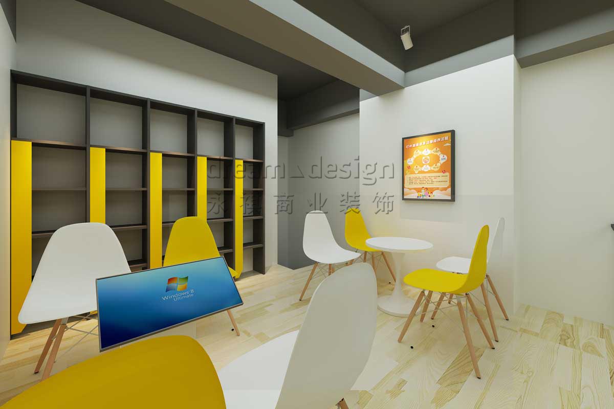 門頭以叮咚為元素,做了叮當造型來詮釋叮咚的輪廓,賦予門頭一種年輕活力的氣息,其次對于色彩,門頭采用主色調(diào)黑色及輔助色橙色相結(jié)合,簡單時尚。店內(nèi)使用暖色系顏色相搭配,使得店內(nèi)空間看起來更加明亮溫馨。店內(nèi)使用格子磚等材質(zhì),使得整個空間充滿活力。頂面不同于一般的吊頂只是對局部做了圓形的吊頂裝飾,整個空間不會顯得特別壓抑。整體空間采用圓形和半圓的形式來體現(xiàn),讓空間富有親和力。